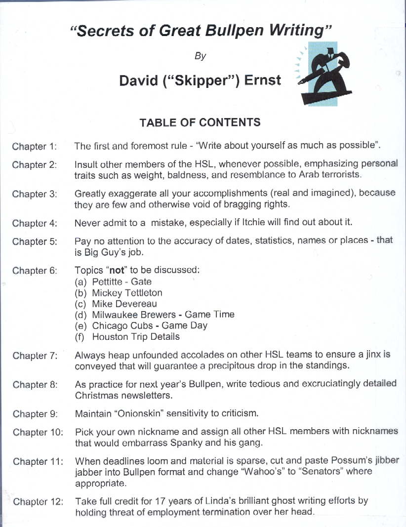 of Great Bullpen Writing,” by David (“Skipper”) Ernst. The “Table of