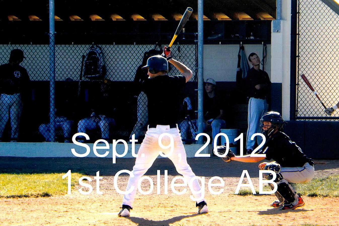 After walking and scoring in his next plate appearance, and then grounding out to short in his third, Joe came to the plate again with two runners on and, again, after falling behind in the count, ripped a 1-and-2 fastball over the centerfielder’s head for his first college double, driving in two more Tiger runs. His line score for the day was 3-3-2-4. Not a bad beginning to his college career.