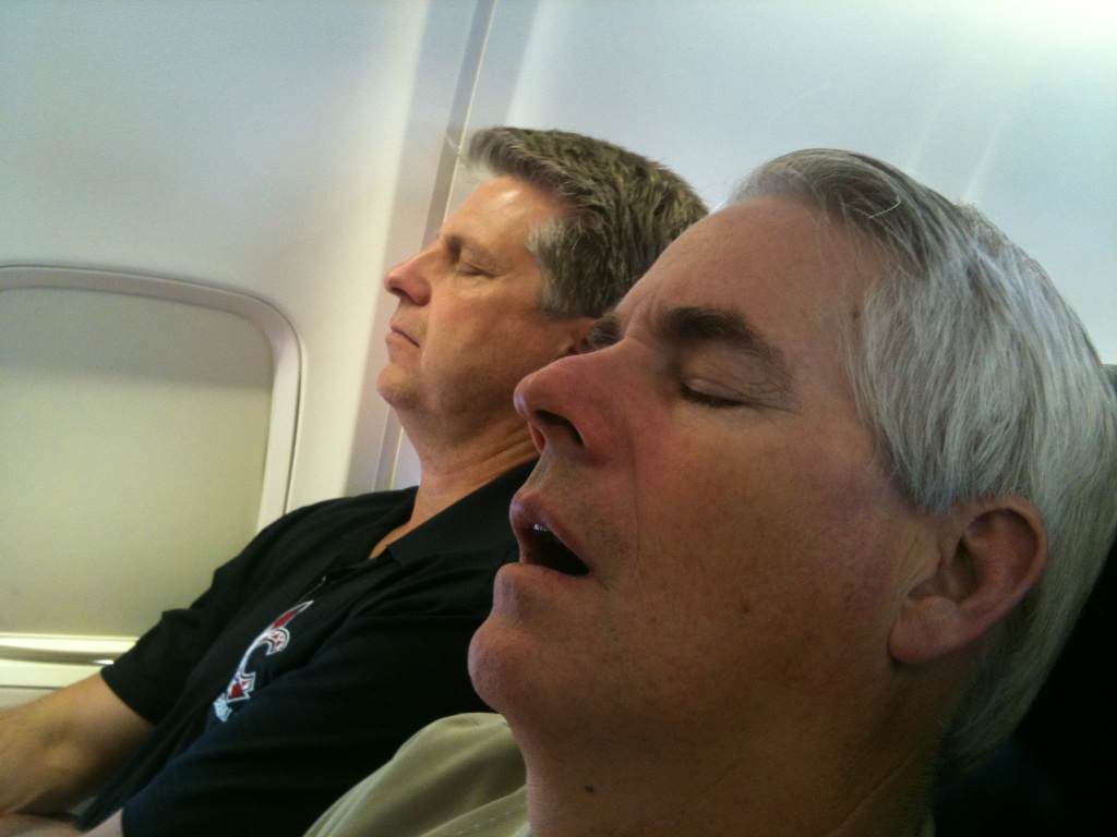 Screwdrivers were offered as the prominent brunch item, so the fun continued. With Itchie tightly grasping 39 Southwest Airlines free drink tickets in tow, we were guaranteed that the revelry would extend on to the plane once we boarded. Our 10:00 departure time approached, so we filed onto our bird in orderly fashion and settled into our seats for the quick jaunt over to St. Louis, our connecting city.