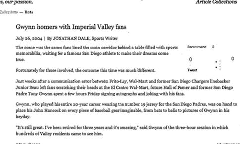 With about an hour to go before the flight, a portly fellow sat down one chair away from me. He sat there anonymously for 10 or 15 minutes before he asked me if this was the flight to Imperial Valley. When I looked up to respond, I realized Tony Freakin’ Gwynn was asking me the question.