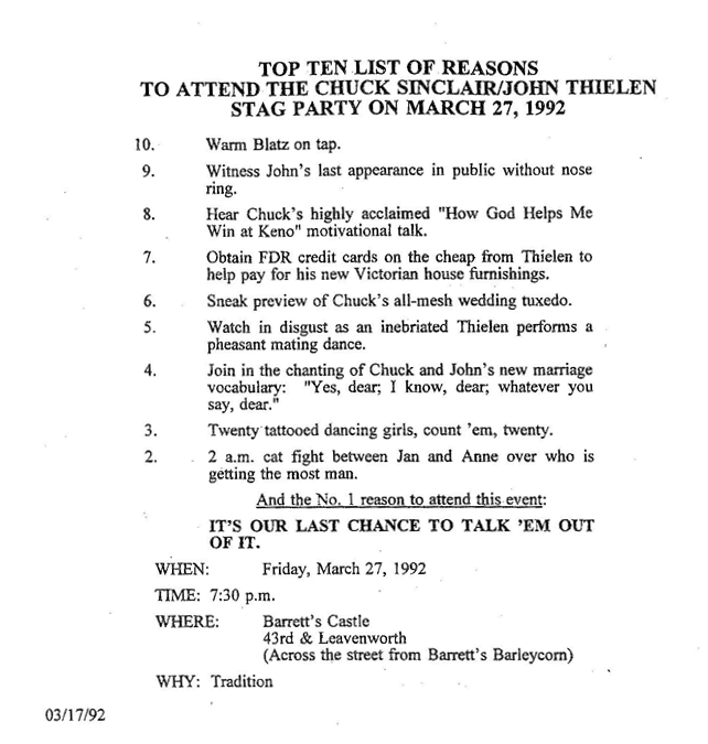 I am sure many of you remember Tony from our 1995 Colorado trip. One hundred beers! Below is a picture of the 1995 Mile High boys (sans Itchie and Tony). Blongo either favors his left side as his “best side” or he thought we were getting a mug shot. Anyway, it is absolutely amazing that we were not mobbed by women.
