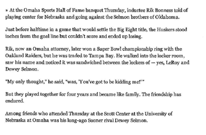 Speaking of fame, I recently attended the Omaha Sports Hall of Fame induction dinner. It was a great event with several inductees we all know such as Phil Cahoy, Dean Thompson and Mike Kemp. Most of the inductees told fun stories, but one inductee, Rick Bonness, told a particularly fun story that showed how even bitter rivals can become life-long friends. The retelling of the story by OWH columnist, Mike Kelly, is below. We all may be ruthless competitors in the HSL, but we are also brothers. Thirty years together will do that to you.