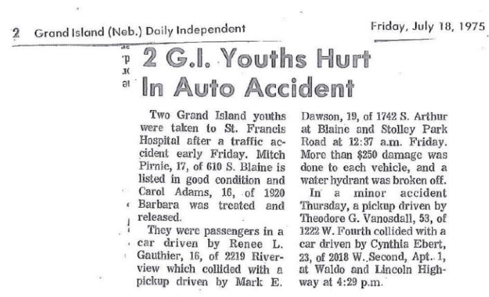 Thursday, July 17, 1975 started out as a good night. Kinda like when the East Coast and Midwest baseball results are coming in and your team is looking good, so you go to bed and wake up to find a couple of pitchers on the West Coast went 20 points negative so your good night goes in the toilet. Me and some buddies got some beer and started to party while driving around Grand Island, NE. There was one particular police offer with whom I had developed a less than friendly relationship during my teenage years… Officer Velasquez. He always intruded on my fun, almost like he was following me. Sure enough, he pulled over my friend’s car to chat with me and try to find my beer. But, no luck that night; we had cleverly hidden the beer to escape detection by a flashlight shined through the window of the car. The traffic stop ended with a lecture about staying out of trouble. Free again, we made our way to a house party. After a few hours, the party began to wind down. A little before midnight, my friend, Rex, and I hatched a plan to take our girlfriends to the hunting/fishing cabin “down by the river.” The girls did not know the way and the general consensus was that neither I nor my girlfriend, Renee, were in the best shape to drive. To navigate, I went with Renee and Rex’s girlfriend, Carol, in Renee’s Dad’s 1971 Buick convertible. Rex drove his car. Carol drove the car, and Renee sat up front because she was very nervous about Carol driving her Dad’s car (with good reason, it turns out). I rode/slept in the back seat.