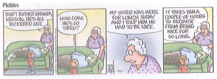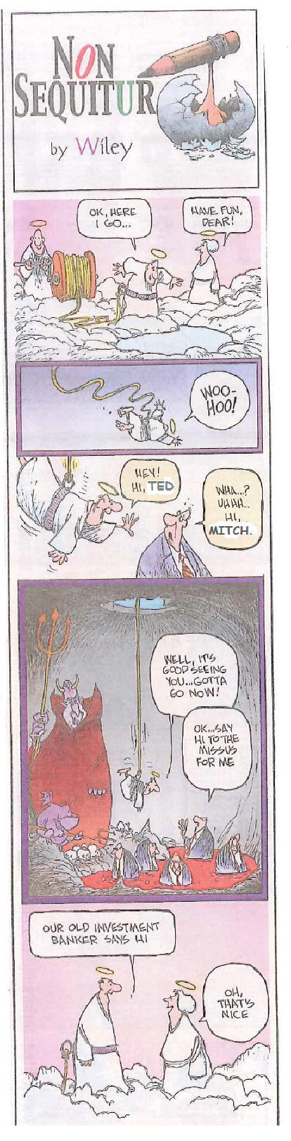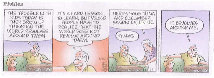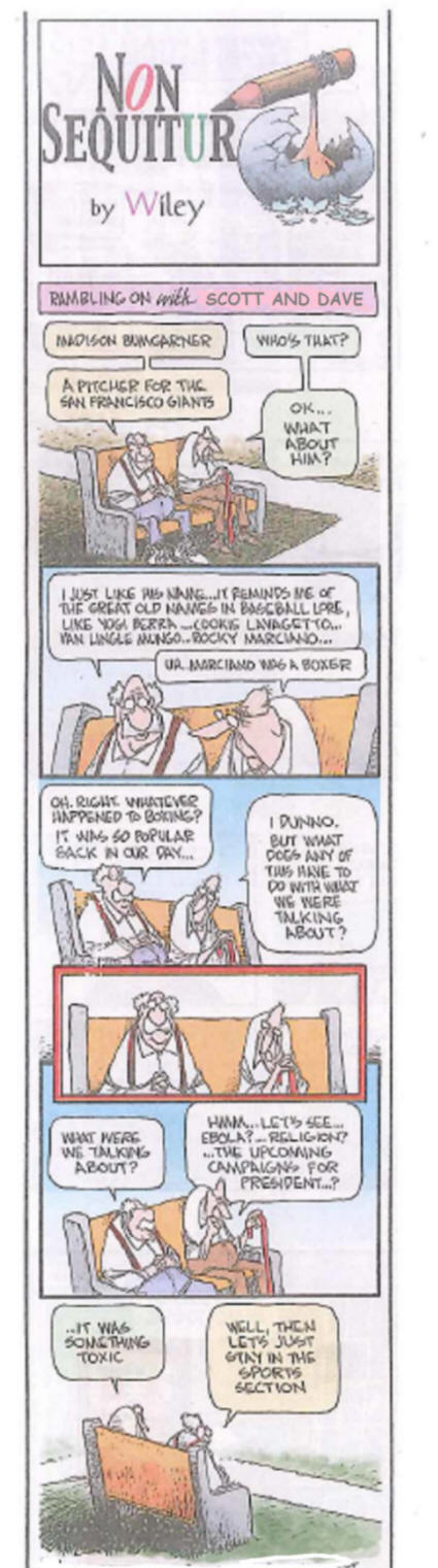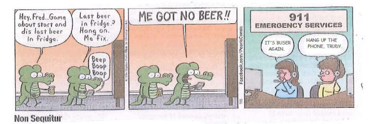 7) From the Desk of David Ernst – Editor Found in Skipper’s trash can: “The most recent persiflage offered by one with the sobriquet ‘Itchie’ was definitely not sesquipedalian; however, it did deliver a few sockdolagers. Bravo, Itchie. Bravo!” 8) Just Us Kids According to the Wall Street Journal, kids’ participation in baseball has declined 41% from 2002 to 2013, dropping from 9 million in 2002 to 5.3 million in 2013. That is depressing! Like most social behavior, there are surely a number of reasons/causes for the decline. More sports and early sport specialization, as well as video games and other electronic entertainment are the most often-cited reasons for a decline. Others speak heresy of baseball being too slow, too boring and too mired in the past. Personally, I think there may be some truth in all those purported reasons/causes of decline in baseball participation. Whatever the reasons, I think baseball has irrevocably entered a new age…and not for the better. Long gone are the days of a vacant lot, handed-down old baseball gloves, a couple of beat-up balls and bats, and a group of kids without an adult around to tell them what, how, when and where to do everything. When left to themselves, kids emulated players, played the “game” they saw and knew, organized themselves, resolved disputes and grew to love the game for reasons beyond the physical play. The game represented comradery, fair play, trust, and respect. Yeah, “Sandlot” is what I am talking about. Love the movie and loved playing baseball when it was “just us kids.” That’s all I got for this edition of Curbside Chronicles…cartoons to follow.