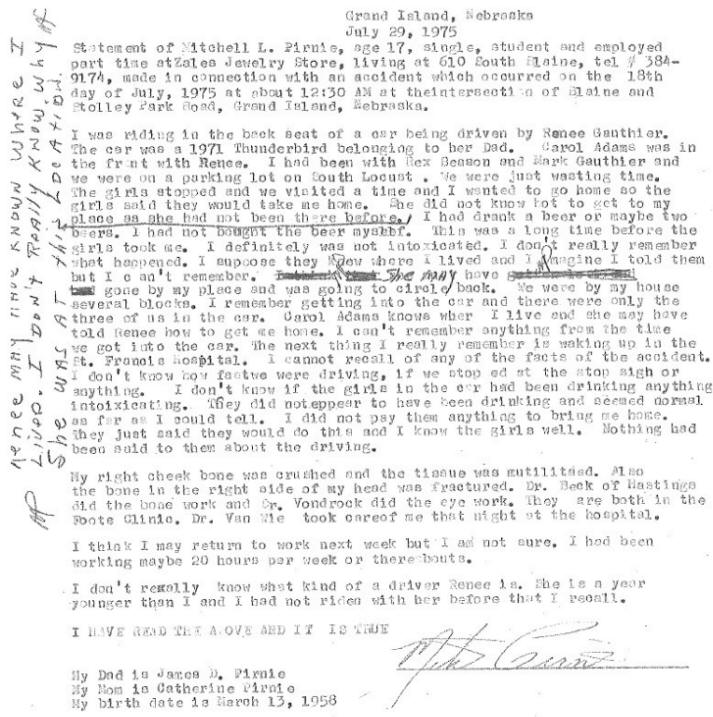 At approximately 12:30 A.M. on Friday, July 18th, Carol ran the stop sign at Blaine Street and Stolley Park Road. An upper classman at Grand Island Senior High, Mark Dawson, driving a pick-up, hit the Buick directly where my head (in blissful slumber) was laying against the window behind the passenger side door. I awoke to the sound of the “jaws of life” trying to free my leg from the wreck. I pulled my leg out and the firemen pulled me out of the car. They gave me a towel to put on my face. I could feel my eyeball as I pressed the towel onto my face. The whole right side of my face felt like a sponge… no bone structure. Of course, Officer Velasquez was at the accident. I vaguely remember him talking to me about how he told me to stay out of trouble earlier. Thereafter, I distinctly remember that my drama teacher, Mrs. Stalker, and her husband (in their pajamas and bath robes) came up to me. The wreck occurred right next to their house. Mrs. Stalker asked me if I was okay. I was in shock and pulled the towel away from my face and asked her how bad was I hurt. I have never seen someone faint that quickly. She went down like a dropped sack of potatoes. I immediately put the towel against my face again (again pushing my eyeball back into my head). Next thing I remember, we were off to the hospital where I met my doctor, Dr. Gene Van Wie, who was soon joined by my father. Doctor Van Wie sat on my chest, held my head between his knees, and told a nurse to hold my arm and told my dad to hold my other arm. He began to stitch up multiple cuts in my face. Even though I was supposedly in shock, it hurt like hell! I began to holler and my dad asked Doctor Van Wie if he was going to give me something. The Doc stopped sewing and looked at my father with a very, very pissed off expression. He said, “Jim, he’s so drunk he can’t even feel this.” In response, I said repeatedly, “Yes, I do; yes, I do; yes, I do.” Without further ado, the good doctor finished his work and I was off to morphine land. After about 10 days in the hospital and a couple of surgeries, I returned home. The day after I got home, a sleazy insurance adjuster (no offense Chuck) came to our house to interview me. I was home alone and he told me that I had to talk with him so the police could complete their report about the accident. I am not proud of what I said to the adjuster, but the mention of police and his very, very pushy, authoritative style scared me. Inasmuch as you know the real story now, I think you will be entertained by the statement I gave the insurance adjuster, below: