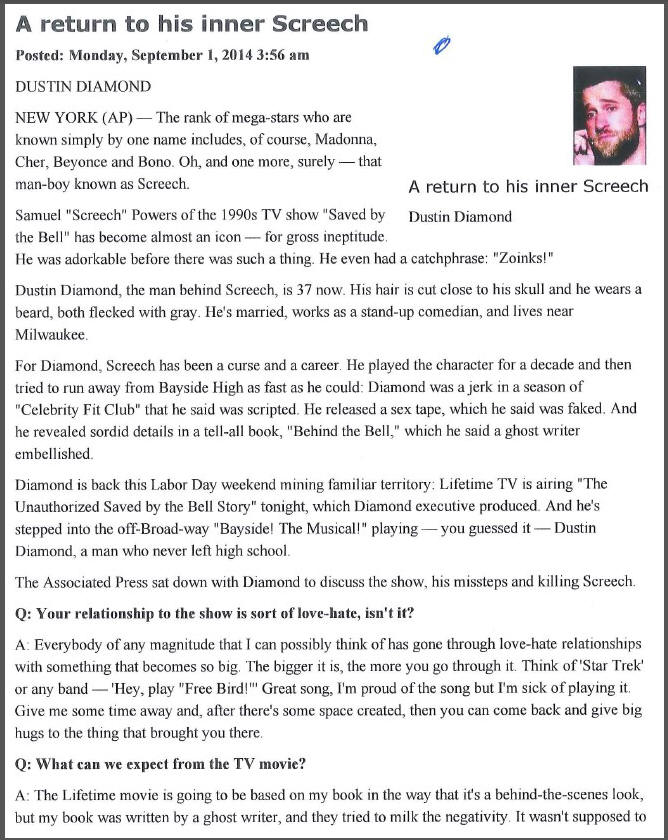 Please note that Bender got a plaque for each award. Just this past weekend, Big Johnny admitted that he was having trouble finding wall space for all his plaques, awards, ribbons, stuffed pheasants, and pictures of himself. 4) What Happened to Screech? You can ask this question in two contexts… (1) What happened to the actor, Dustin Diamond, who played the character “Screech” on “Saved by the Bell”? or (2) What happened to last year’s HSL champion and #1 draft pick holder this season? In response to the first question about Dustin Diamond, a Google search quickly identified this article: