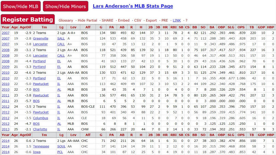 Having recently read and reported on Out of My League and Bottom of the 33rd (both of which deal extensively with the trials and tribulations of career minor leaguers trying to make it to The Show, and stay there, in spite of talent deficits, injuries, bad timing, and bad luck), I was thoroughly intrigued with the baseball journey of Lars Anderson. In researching Lars Anderson’s professional baseball history on my iPad, I learned that he is one of those extremely talented baseball players who has been good enough to make it through every level of the minor leagues and all the way up to the Bigs; but unfortunately, just not good enough to stick. His minor and major league numbers, detailed below, tell the story of Lars Anderson.