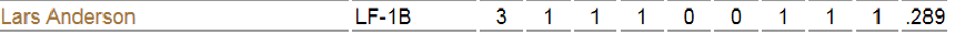 For the evening, Lars’ line score was as above, and he acquitted himself well in the field as well. He single-handedly put a dagger into a Missions rally by hustling in to scoop up a single and then fire a dart to the plate to nail the runner who was trying to score from second. Here’s a picture that I took of him as he came into the dugout after uncorking this splendid throw.