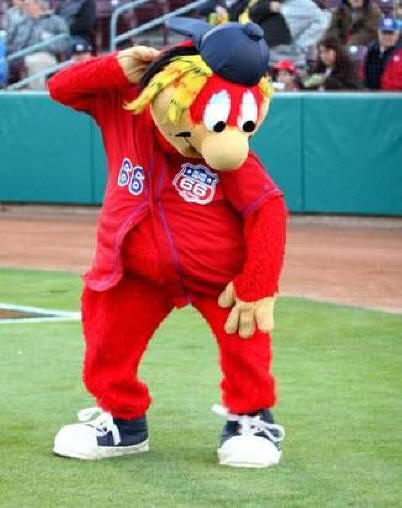 As entertaining as the 23-hit game was, the crowd was even more entertained by the madcap San Bernardino mascot ingeniously monikered Bernie. As one can see from the pictures that follow, it is uncertain, to say the least, what type of creature Bernie is designed to represent, and at first I thought that the Bern was going to be just one more annoyingly perky team mascot.
