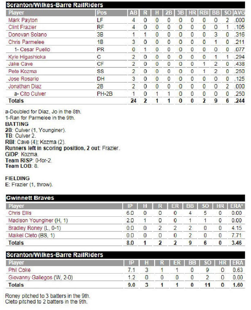 The starting pitcher for the Gwinnett Braves was household name Chris Ellis, who threw six innings of no-hit ball while walking 4 and striking out 5. After reliever Madison Younginer earned a hold by pitching 2 innings of shutout ball, the Braves brought in reliever Bradley Roney, who promptly walked 2 of the 3 batters that he faced, and then plunked the third one. After the Gwinnett skipper pulled out the shepherd’s hook and yanked Roney, the new Braves pitcher was Maikel Cleto, he of the 7.71 ERA. To the delight of the home crowd, Cleto screwed the pooch and walked RailRider center fielder Jake Cave to push across the tying run, and then issued yet another base on balls to shortstop Pete Kozma to plate the winning run. For Kozma, a walk-off walk, something that doesn’t happen very often.