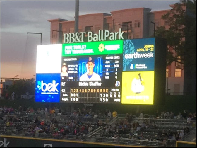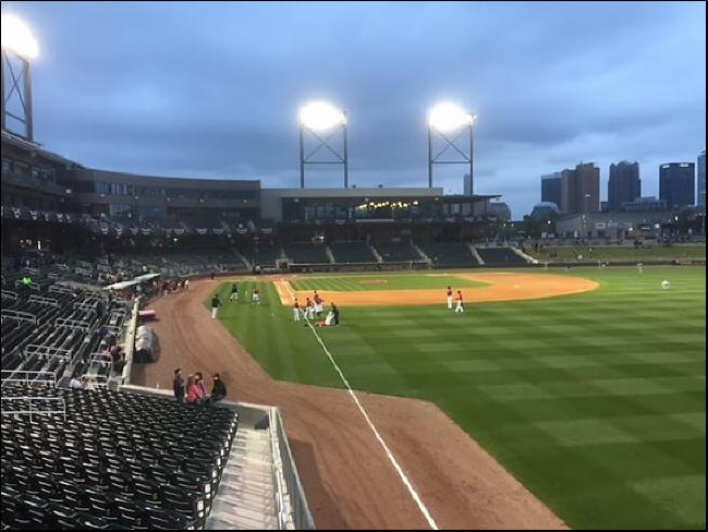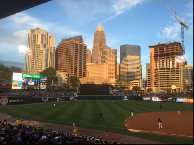 On Friday night, after a long day of depositions in Anderson, South Carolina, I made the two-hour drive to Charlotte, NC, where my flight home to Omaha was scheduled for Saturday morning at 0-dark:30. As luck would have it—actually, there was no luck at all, just visionary planning—the AAA Charlotte Knights were home for the second tilt in their season-opening series against the visiting Durham Bulls. After parking my car in the Green Lot, I hopped (okay, lumbered) out of my rental vehicle with the anticipation of a child at Christmastime to see this new green cathedral which has been hailed by many as the top minor league ballpark in the country. As I sped (okay, hobble-trotted) my way from my parking spot to the ballpark, I came out from around a building and saw the shiny gem known as BB&T Ballpark in all of its splendor. As I made my way around the park and saw how it has been so ingeniously placed in the middle of some of the most beautiful and vibrant downtown skyscrapers and other architecturally-pleasing structures anywhere, I found myself practically talking and laughing to myself about this spectacular new venue, now in its third year.