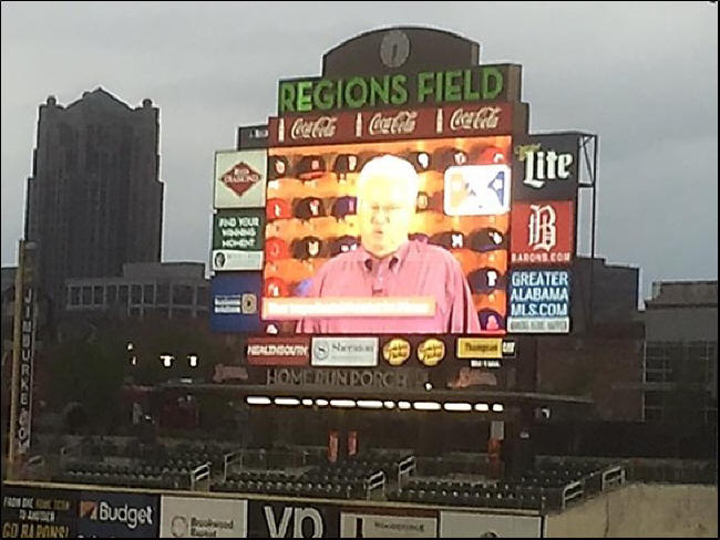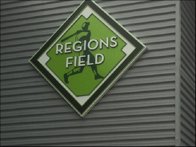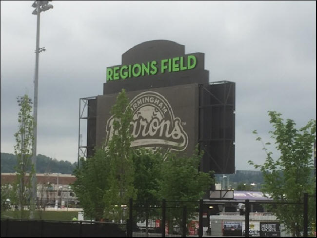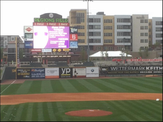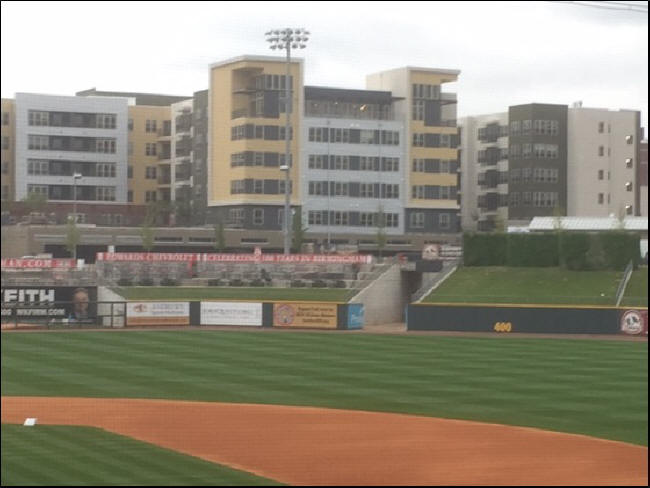 On Wednesday night, I visited a jewel of a new park in Birmingham by the name of Regions Field, home of the AA Birmingham Barons of the Southern Association. This breathtaking green cathedral was constructed four years ago as the centerpiece of the city’s impressive and ongoing downtown redevelopment. I can imagine how cool it would be to live in one of the new condos just beyond the outside fence, as depicted in the below photo.