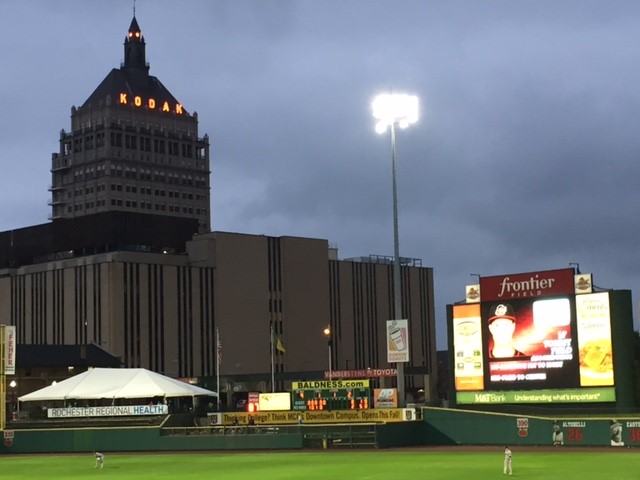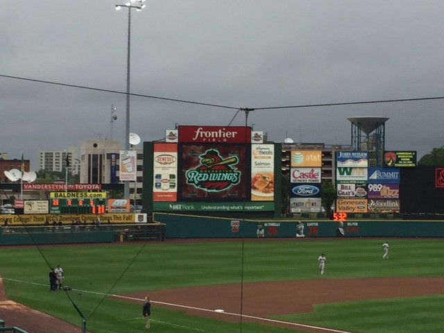 After checking in to the under-renovation (a gross understatement) Hyatt Hotel in downtown Rochester, I hoofed it over to beautiful Frontier Field just a little over a mile away for a AAA International League game between the Red Wings and the visiting Scranton/Wilkes-Barre Yankees. Frontier Field is a beautiful gem of a ballpark, ranked 3rd on a lengthy list of Minor League ballpark rankings that I carry around with me wherever I go, just behind Parkview Field in Ft. Wayne, Indiana, and Blue Wahoos Stadium in Pensacola, Florida. I am unable to disagree. With the aforesaid Kodak Tower looking over the ballpark on the third base side, and an active CSX “Chessie” railroad line located just beyond the outfield from center to right, Frontier Field has a very urban and yet very intimate feel. And although it was only built in 1996, the park reeks of a long history of Red Wing baseball.