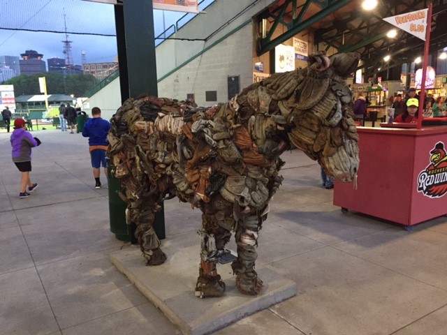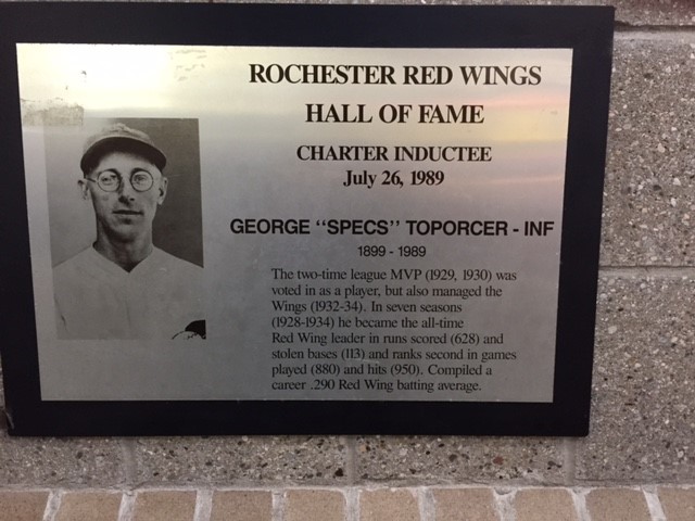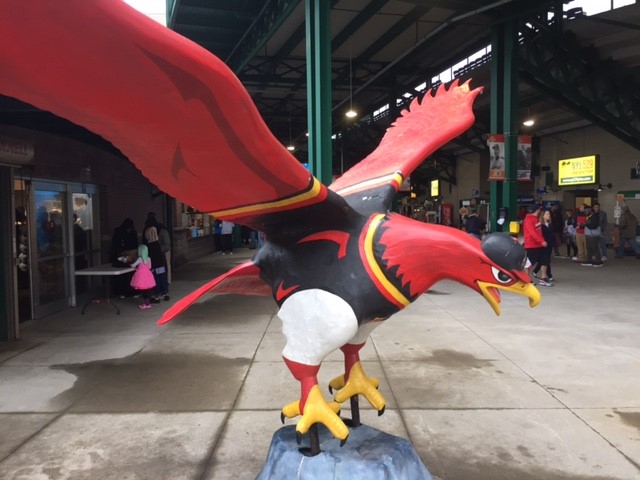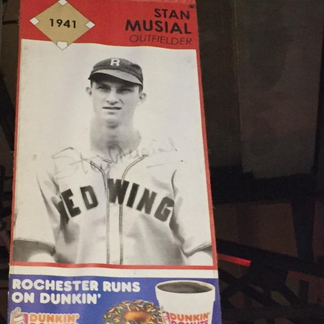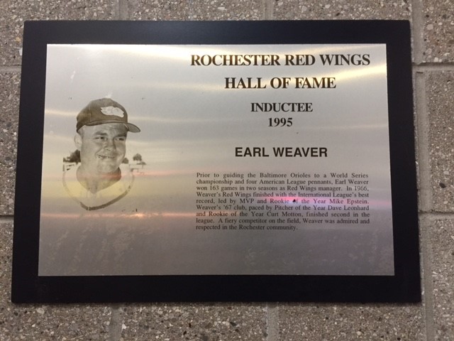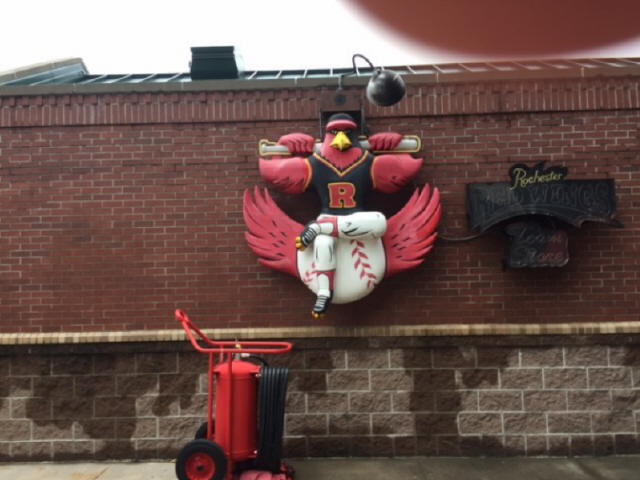 There were a lot of things to like about Frontier Field and the ballgame experience to which I was treated, including: The playing of the Star Spangled Banner by the Thomas C. Armstrong ensemble, perhaps the worst music I have ever heard since Joe played the saxophone in the Beadle Middle School band; the tasty Rohrback Red Wing beer served at the concession stand; the statue of the large redbird in flight just inside the stadium entrance, wearing a Red Wings ballcap (see picture below); the display of about 50 plaques for all of the members of the Rochester Red Wing Hall of Fame (see below); and the large banners featuring former Rochester greats which are found all throughout the ballpark.