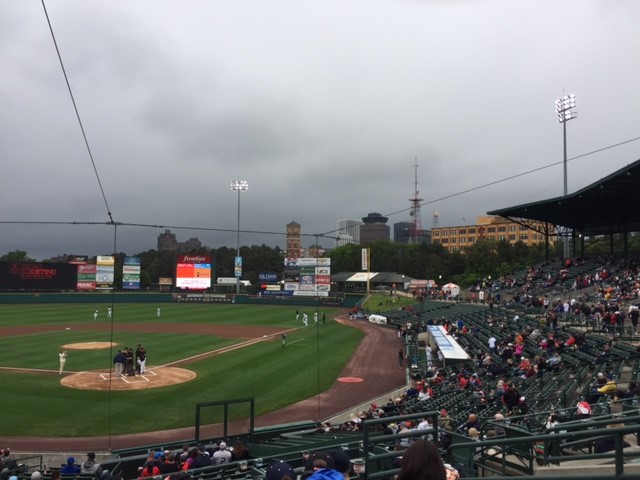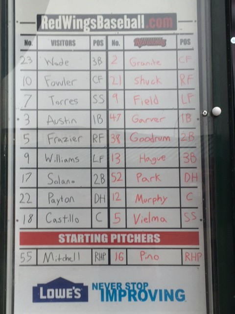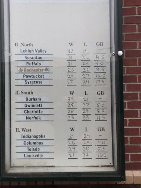 On a chilly northeastern night, I watched the hometown Red Wings take a 2-run lead by pushing across single runs in the 1st and the 3rd, after which Yankees’ shortstop Gleyber Torres hit a 3-run blast off Rochester pitcher Yohan Pino in the top of the 6th to take a 3-2 lead. Scranton/WB pushed across 3 more in the top of the 7th, and Rochester added 1 in the bottom of the frame, for the final score of 6-3, Yankees.