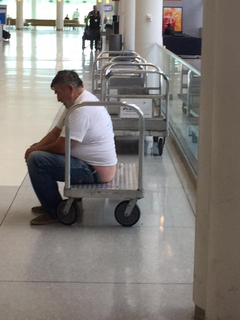Before I close out this issue of From the Bullpen, I leave you with a picture of a fella that I saw at the Rochester airport, just as I was getting ready to go through security. I was disappointed that I could not stay long enough to watch him stand up and see what would happen with his trousers, but I have a pretty good idea. Anyway, send me your best captions for this photograph and we will post them in the next issue of From the Bullpen.
