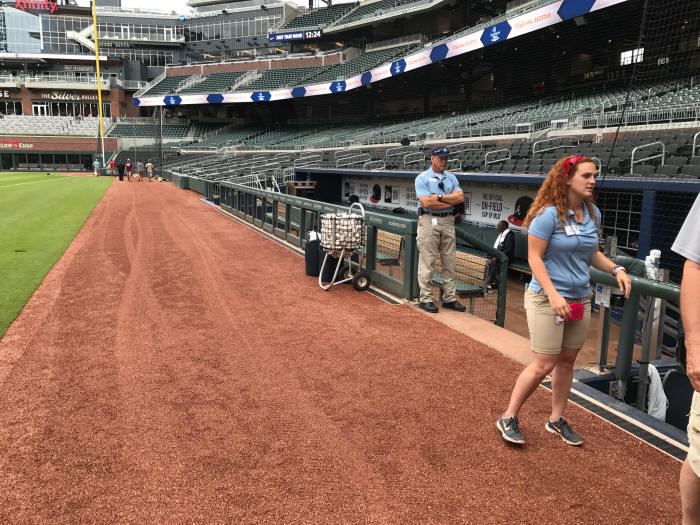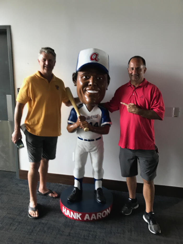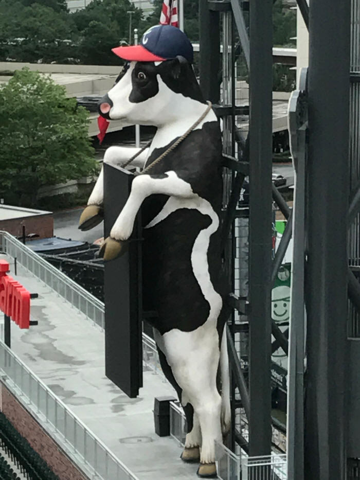 The tour itself was worthwhile and quite impressive. This 90 minute trek took us through the bowels of the stadium all the way to the peak, and examined every nook and cranny in between. This let us see the nuances and fine touches that just might set Sun Trust Park apart from many of the other new stadiums we have visited. They have done a fabulous job of documenting and displaying the history of the franchise, even though Morgan our tour guide couldn’t tell us if they were the Boston Braves or the Milwaukee Braves first. There was a rightful focus on Hank Aaron as well as the tremendous run of success that the Braves had in the 90’s. The Cy Young Awards in 6 of 9 years (Maddux, Glavine, Smoltz) and 20 Gold Gloves between Andruw Jones and Greg Maddux were prominently on display. We were able to step onto the field (but damn sure not the grass), and get a nice view into the pricey suite life that is clearly the bell cow for the team’s revenue projections. Speaking of cows, one of the more interesting points on the tour was the Chick-Fil-A cow beyond the center field stands, who apparently was aroused by his sandwich board and decided to mount it like a Phi Delt on a sports reporter.