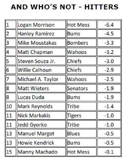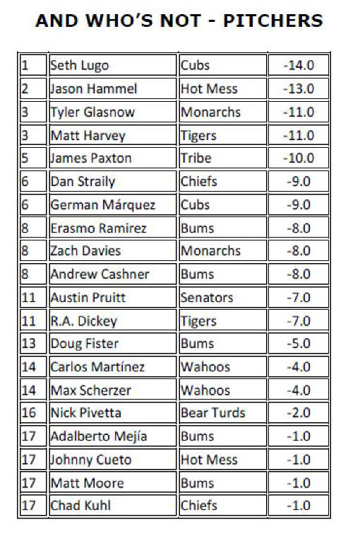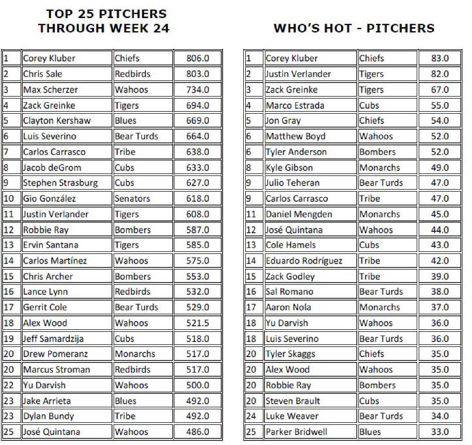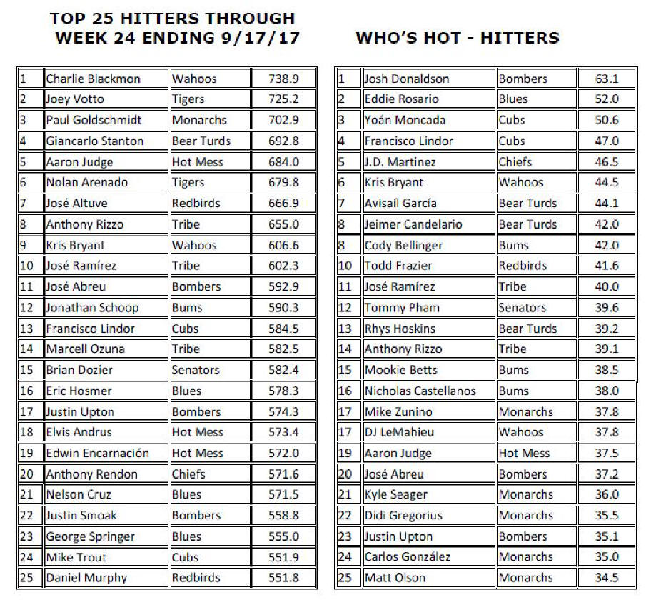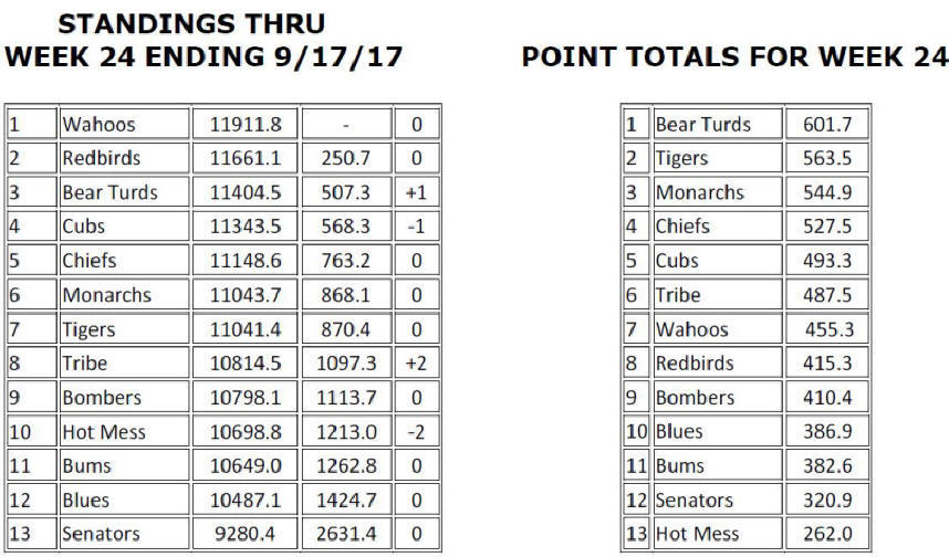 WAHOOS CLOSE TO CLINCHING; REDBIRDS STILL HOPEFUL; BEAR TURDS CONTINUE EN FUEGO FINISH Gentlemen: With 24 weeks of play in the jar and a mere fortnight of the regular season left, PAwesome is on the cusp of clinching the first repeat HSL championship title since the Tigers’ glorious three-year run from 1987 to 1989. With a 250.7-point lead and plenty of innings left to pitch, it would take an act of God or an Act of Congress or, perhaps, an act of Kim Jong Un to prevent the Wahoos from wrapping up another crown. Don’t fail us now, Rocket Man! Of course, Jim Ed does not plan to sit idly by and accept his fait accompli as bridesmaid once again, and may pull out all the stops in these next two weeks to try to make it interesting, at least. Meanwhile, the hottest team in the league for the past six weeks or so, the once appropriately-named Bear Turds, forged another 600+-point week to close within 507.3 points of the lead, all but securing another money finish for SloPay. I’m not sure what PED SloPay has been utilizing during the second half of the season, but it’s working like a charm. I doubt that there’s any way to verify this, but I would venture to say that the Bear Turds have scored more points in one month’s time than just about any other team in HSL history. Bully well done, Denny! And now for all the usual stuff: